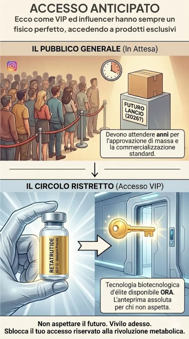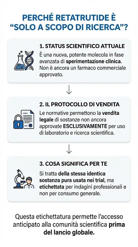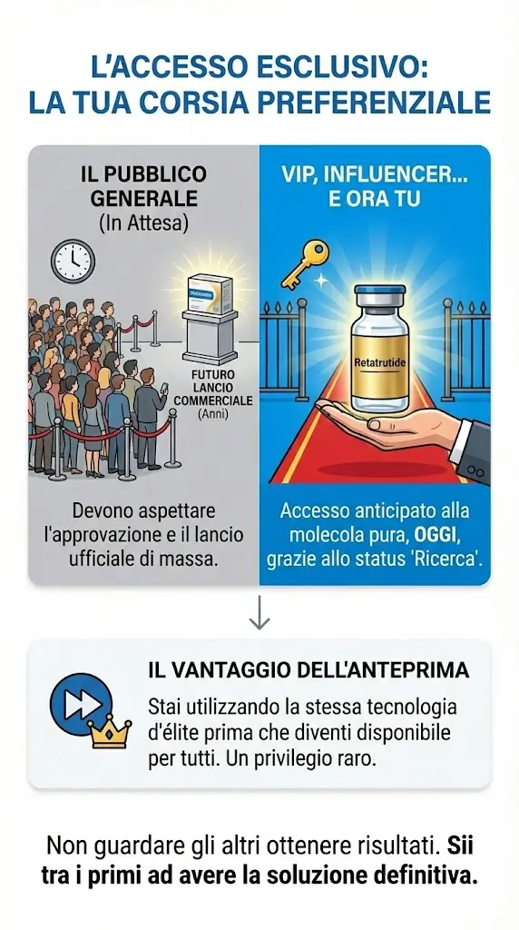 È il "passaggio segreto" che ci permette di darti questo prodotto oggi, invece che nel 2026. Le grandi case farmaceutiche devono aspettare anni di burocrazia per venderlo in farmacia. Noi lo distribuiamo come peptide di ricerca (Swiss Research). La molecola è identica (purissima al 99%), ma senza il ricarico di prezzo delle multinazionali e senza tempi di attesa biblici.